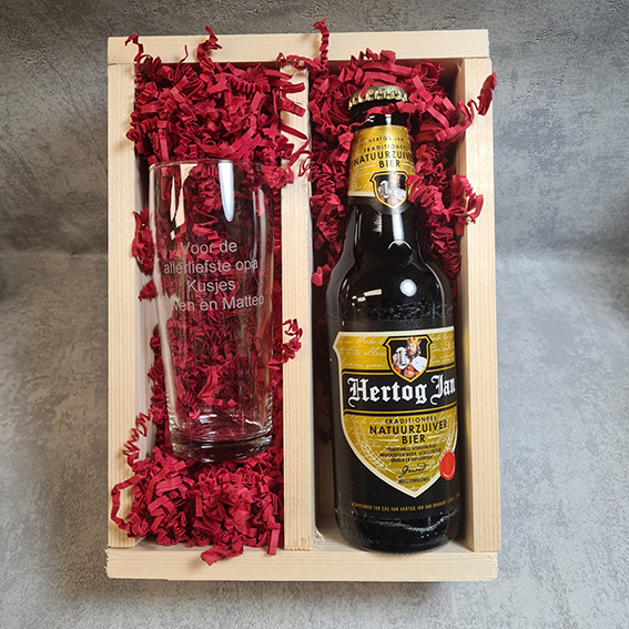 Het Hertog Jan bier kerstpakket is een origineel en persoonlijk kerstcadeau voor de bierliefhebber. In dit feestelijke bierpakket vind je een flesje Hertog Jan en een mooi gegraveerd bierglas, volledig naar wens gepersonaliseerd. Laat het bierglas graveren met een naam, logo, tekst, foto. Of laat een eigen ontwerp in het glas graveren en maak van dit pakket een uniek cadeau. Dankzij onze duurzame zandstraaltechniek voor bierglazen graveren blijft de gravure haarscherp en slijtvast. Bestel dit kerstpakket met bier per stuk als persoonlijke kerstcadeau, of in grotere aantallen voor de zakelijke markt.