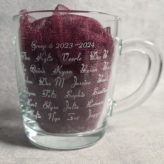 Je kunt het theeglas met tekst, naam, foto of logo volledig naar wens laten aanpassen. Bij je bestelling kies je een passend lettertype of upload je eenvoudig jouw eigen ontwerp, foto of logo. Zo zorgen we voor een gepersonaliseerd cadeau helemaal past bij de ontvanger. En omdat wij werken met glas van hoge kwaliteit, blijft jouw gravure jarenlang mooi, zelfs in de vaatwasser. Glas graveren gaat bij ons met zandstralen, deze manier van theeglazen graveren zorgt ervoor dat de gravure niet vervaagd. Maar het permanent in het glas gegraveerd is.